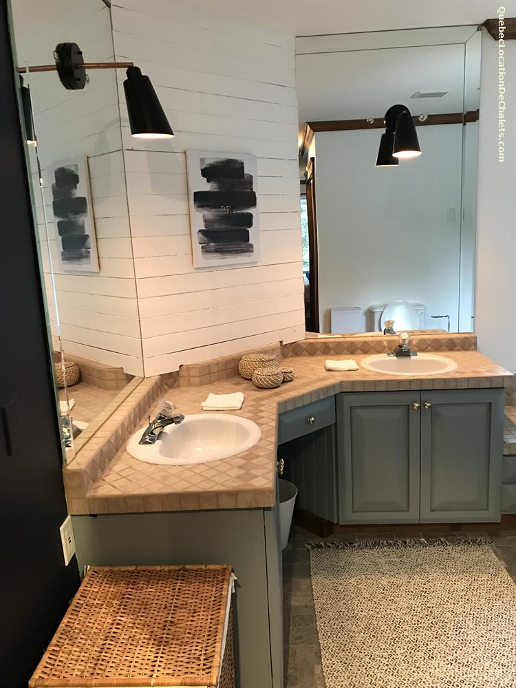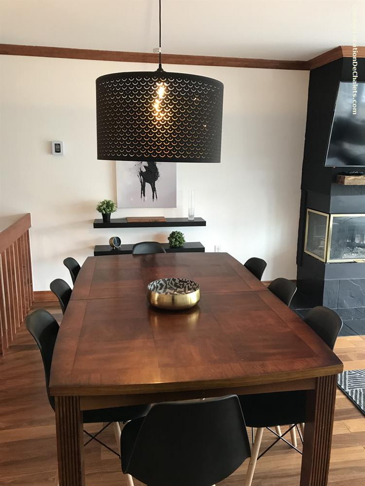 Aires de vie (cuisine, salle à manger et salon) au 2e étage avec magnifique vue sur les pentes. Comprend: une chambre avec deux lits simples, une chambre avec un lit queen, une chambre avec un lit king, 2 salles de bain complètes, une salle d’eau, beaucoup de rangement, cuisine entièrement équipée, produits de nettoyage, literie, serviettes de bain, foyer au bois, téléviseur 55 pouces dans le salon, internet illimité et air climatisé.