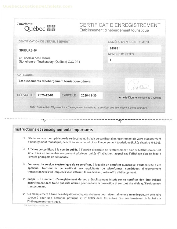 Un dépôt de garantie remboursable d'un montant variant de 750,00 $ à 3 000,00 $ par unité d'hébergement est exigé pour chaque location. Ceux-ci varient selon la grosseur et la capacité de votre hébergement.
