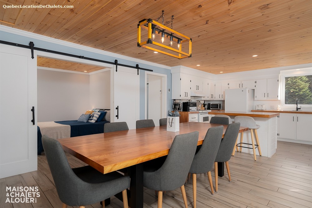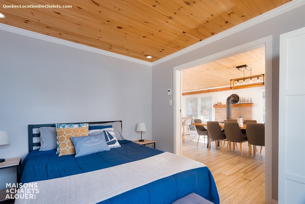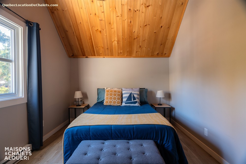 Ce chalet à louer offre trois chambres fermées, une chambre au rdc avec lit Queen, deux chambres à l'étage avec lit Queen et lit Double et deux jolies salles de bain complètes. La vaste pièce commune regroupe la cuisine, la salle à manger et le salon ouvert, elle est également équipée d’un foyer à bois et au gaz dans le salon. En terminant, les propriétaires ont pensé à votre confort avec un plancher chauffant partout au rdc.