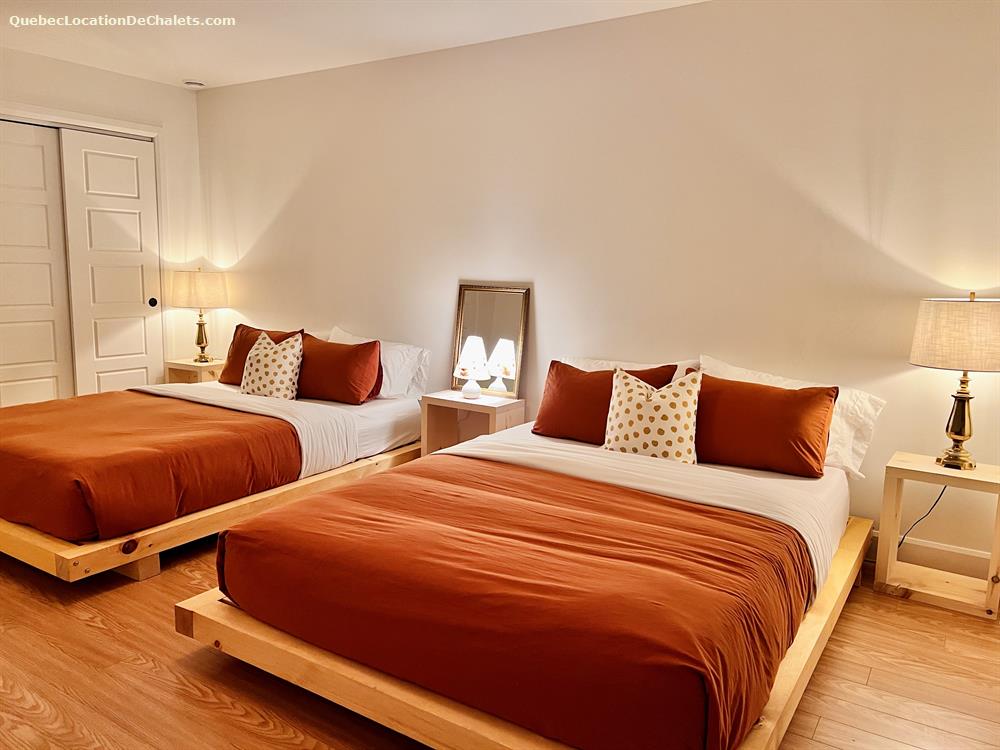 Au rez-de-jardin, vous trouverez la salle familiale avec télé de 50” et table de babyfoot (foosball). Vous trouverez également deux chambres. L’une avec deux lits Queen et l’autre avec un lit Queen. Une salle de bain complète avec buanderie se trouve aussi sur ce palier. La porte patio vous donne accès au SPA privé et au terrain surplombant la rivière La Diable.