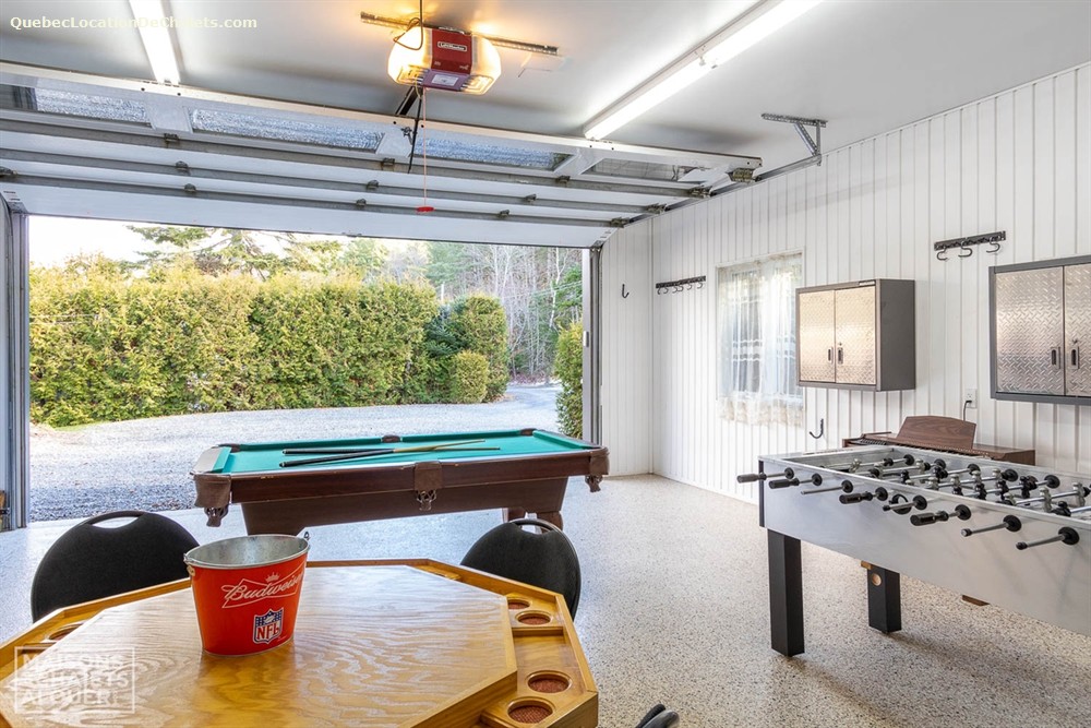 Garage (accessible par l'intérieur, par le couloir au sous-sol) : Table de billard et babyfoot, table de poker.