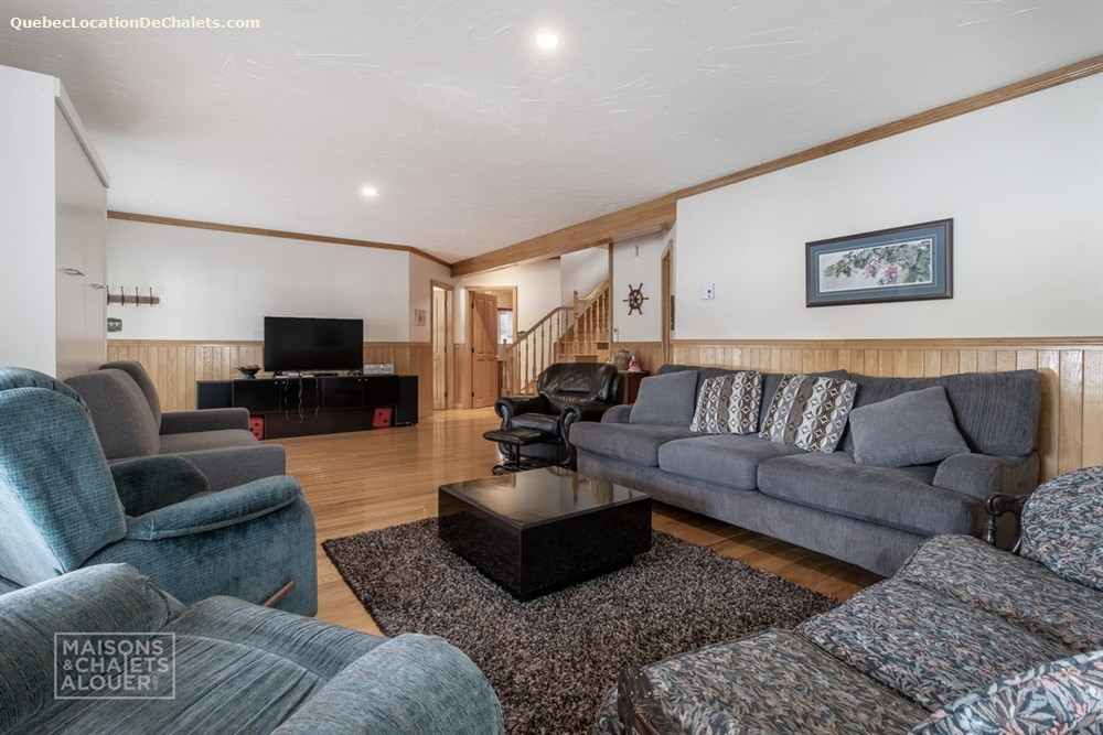 À l'étage inférieur : Salle familiale avec télévision avec un lit mural Queen / 1 chambre fermée avec 2 lits / 1 chambre fermée avec 2 lits / Couloir menant au garage / 1 chambre avec 2 lits (au bout du couloir, avant de remonter vers le garage) / 1 salle de bain avec bain et douche.