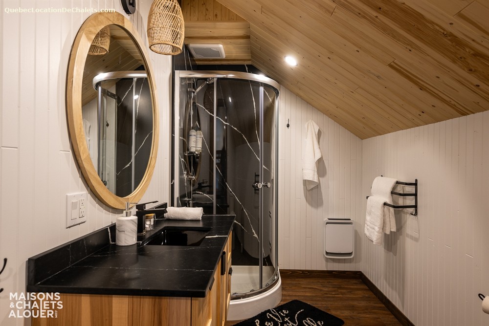 À l'étage : Chambre #3 avec un lit Queen ainsi qu'un lit superposé comprenant un lit simple en haut et un lit Queen en bas / Salle de bain avec douche