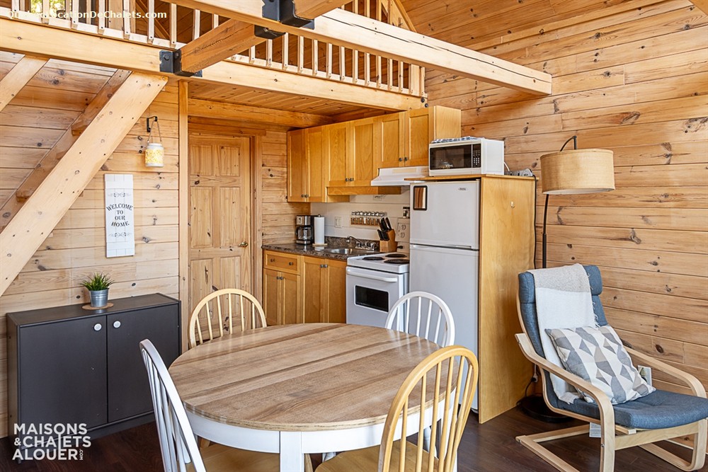 Rez-de-chaussée : Salon avec sofa-lit, salle à manger et cuisine à aire ouverte / Chambre #1 : 1 lit Queen / Salle de bain complète avec douche