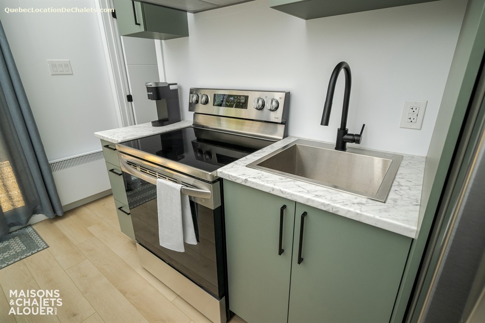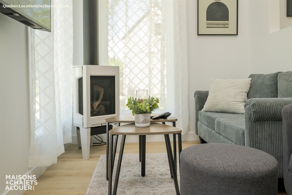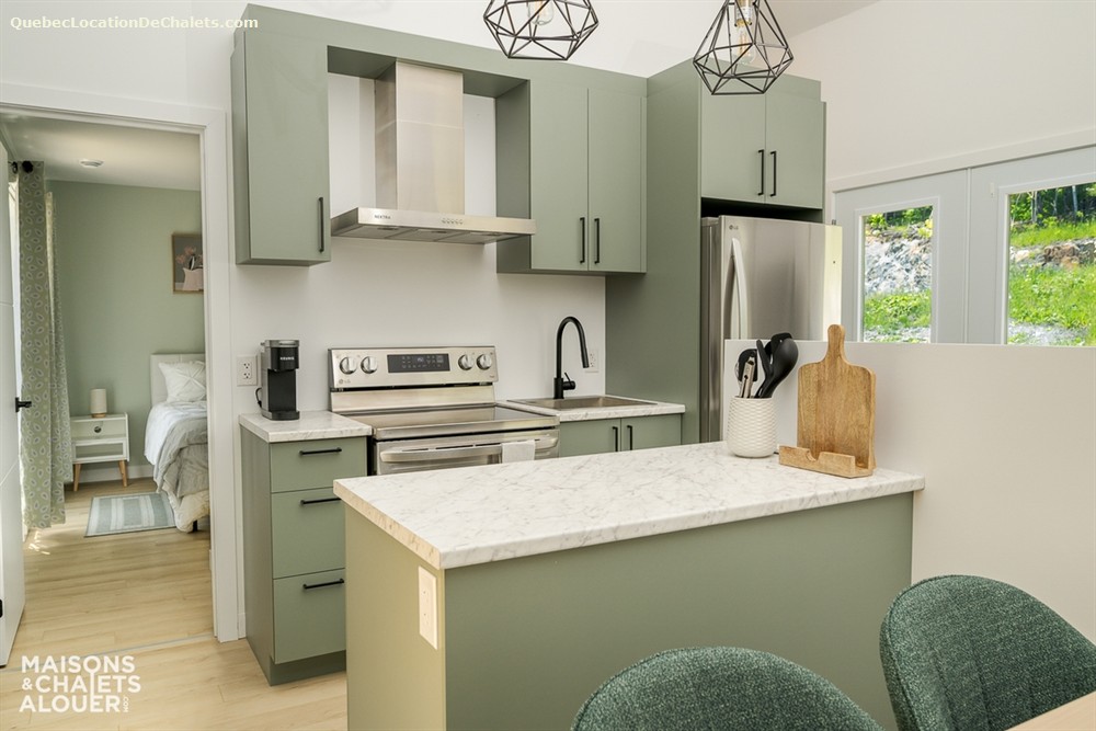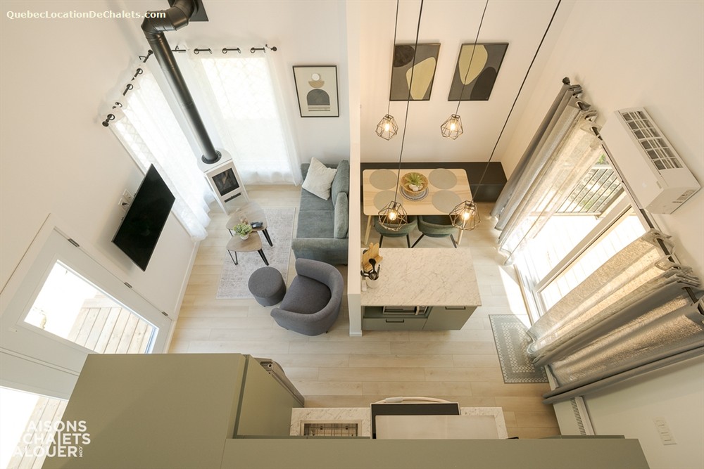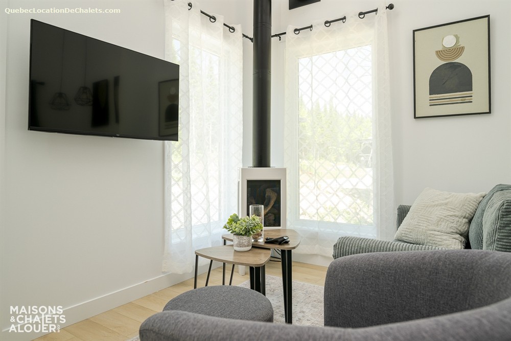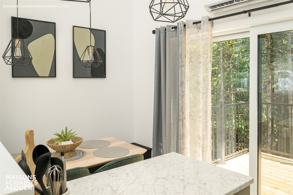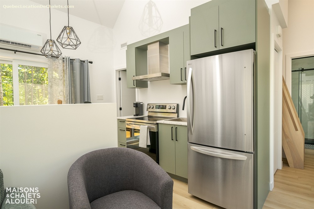 Ce chalet bien pensé vous accueille dans un espace lumineux et chaleureux, où chaque pied carré est optimisé. De grandes fenêtres laissent entrer la lumière naturelle et offrent une vue apaisante sur l’environnement boisé. La cuisine moderne et entièrement équipée permet de cuisiner facilement vos plats préférés, et l’aire ouverte favorise les moments conviviaux.