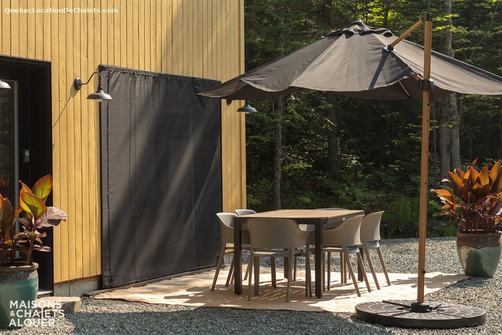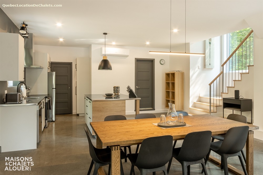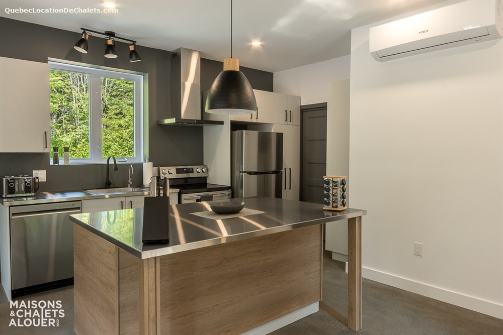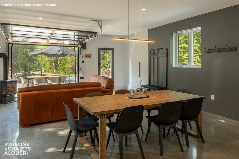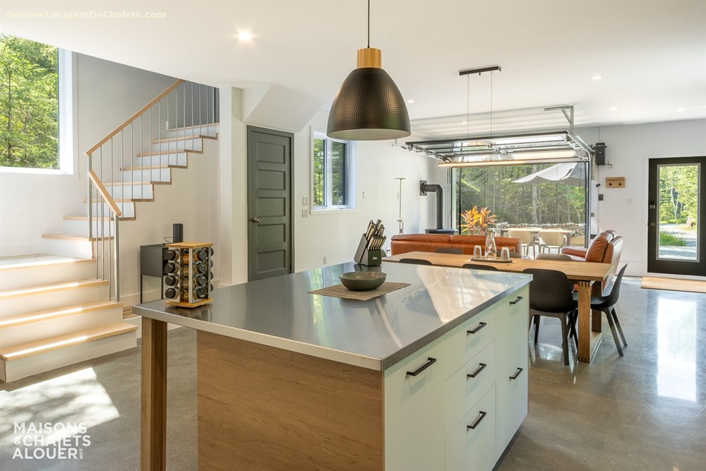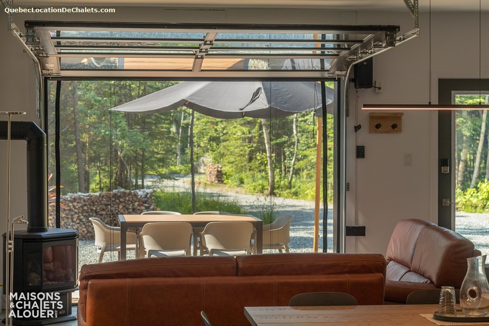 L’ambiance « atelier » combine des comptoirs en acier inoxydable, un plancher de ciment (chauffant) et un large accès vitré vers l’extérieur actionné mécaniquement pour une vue originale sur la nature. Isolé dans un domaine privé, l’Atelier n’a pas de voisins immédiats, pour une totale tranquillité. Les beaux jours, vous aimerez prendre votre café ou vos repas sur une vaste terrasse donnant directement sur la forêt peuplée d’oiseaux. En suivant le sentier sur 150 mètres, vous arriverez au splendide lac Breeeches. En soirée, après une journée de détente ou de sport, vous pourrez vous prélasser au coin du feu et écouter votre musique préférée (haut-parleurs Bluetooth).