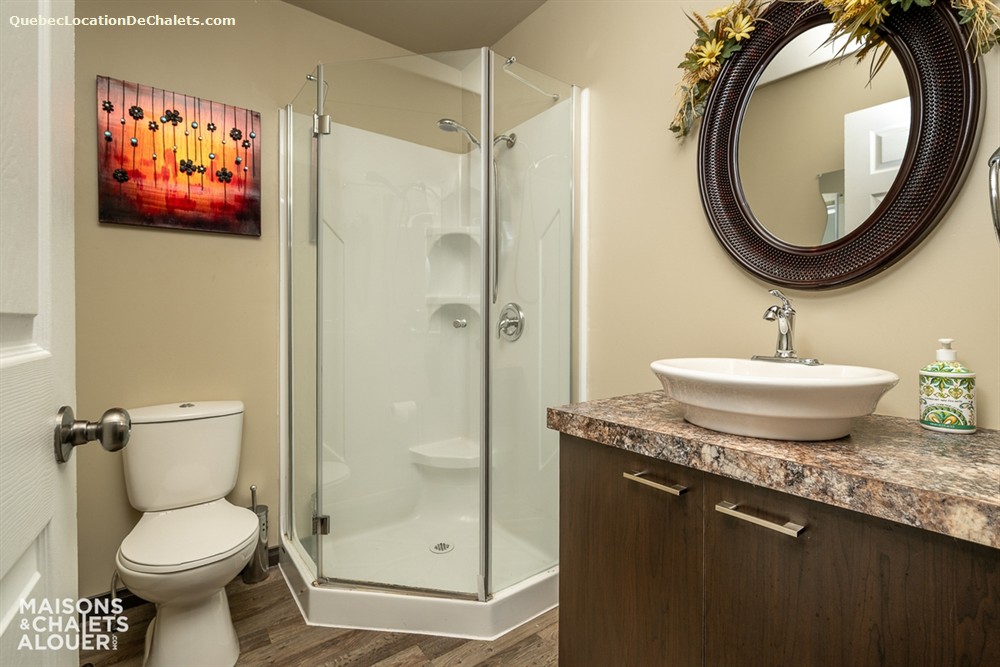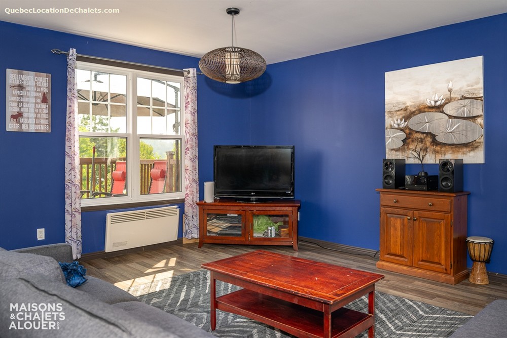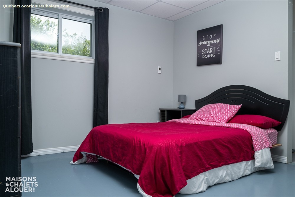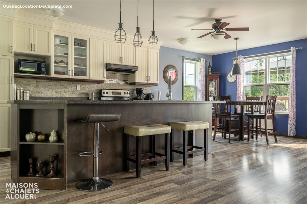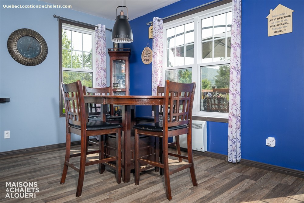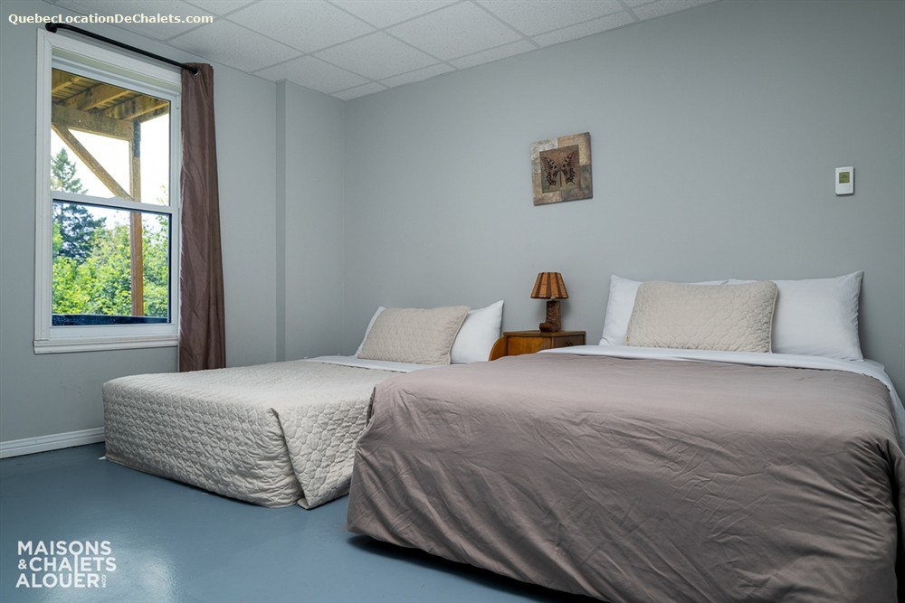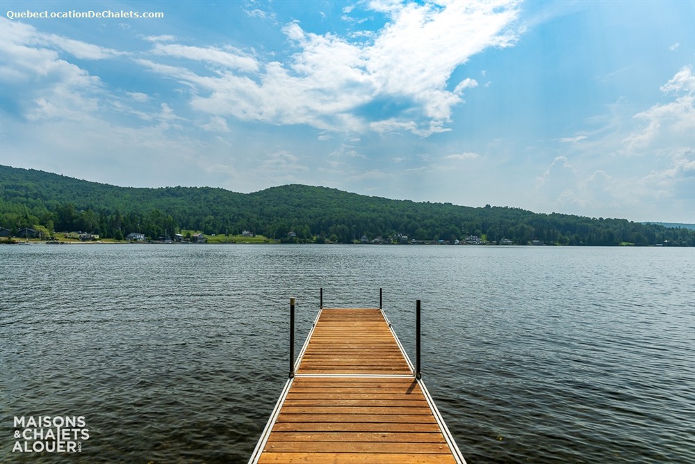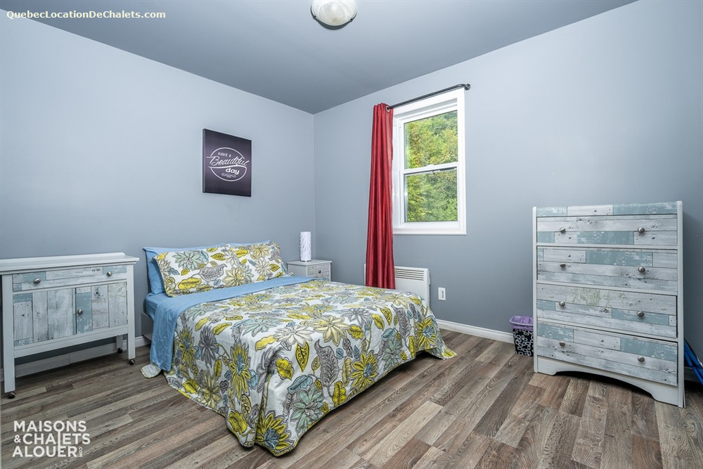 Ce chalet à louer compte 4 chambres à coucher fermées. L'étage principal est à aire ouverte et comprend une cuisine, une salle à manger ainsi que le salon. Le tout bien fenestré, vous laissant apercevoir le lac. Vous y trouverez également l'accès direct vers la terrasse. Une chambre ainsi qu'une salle de bain complètent cet étage.