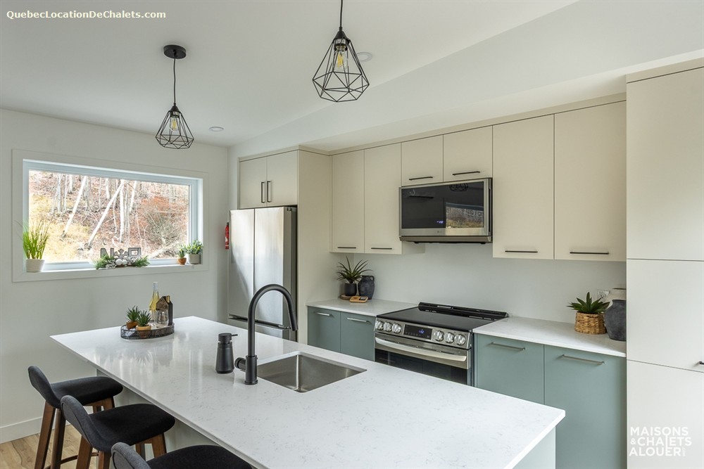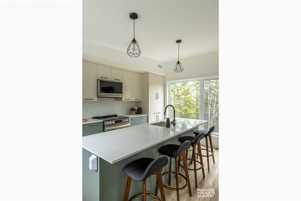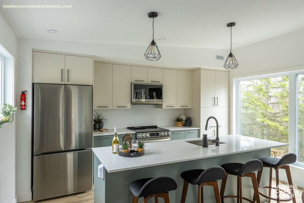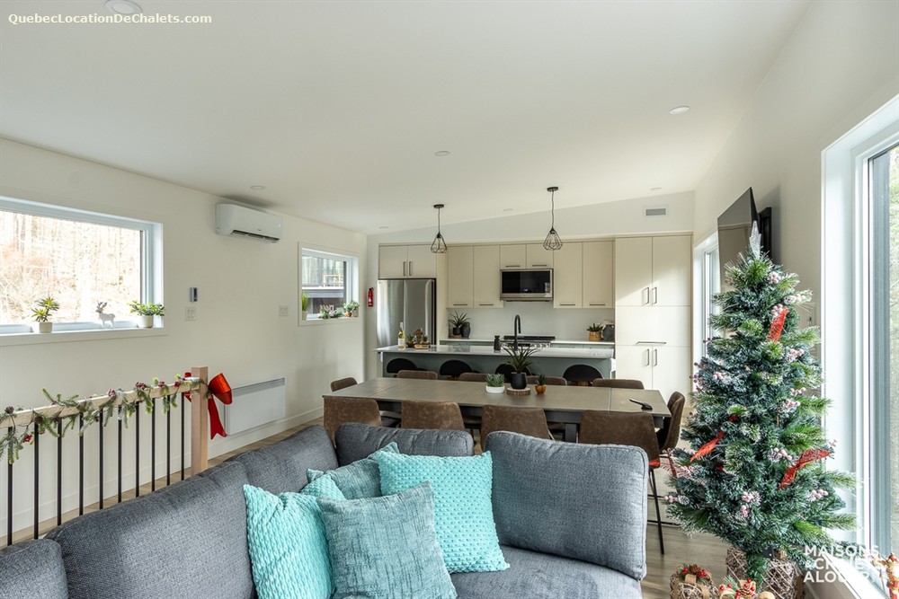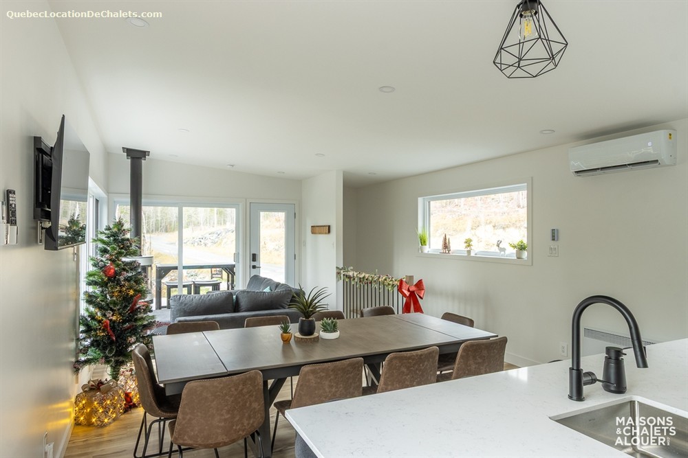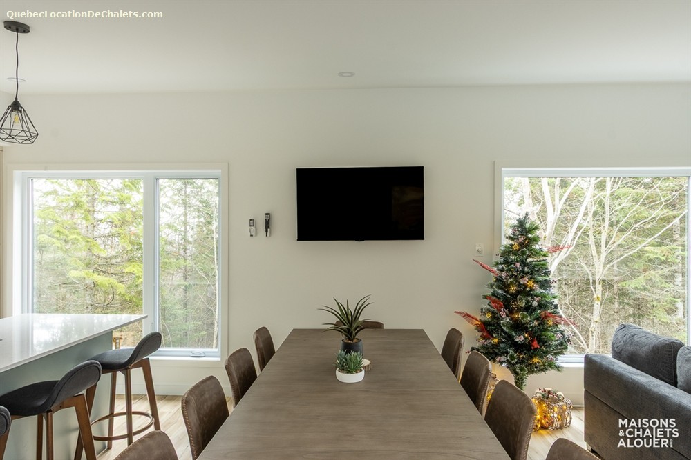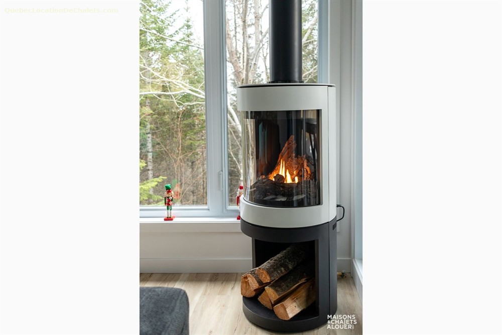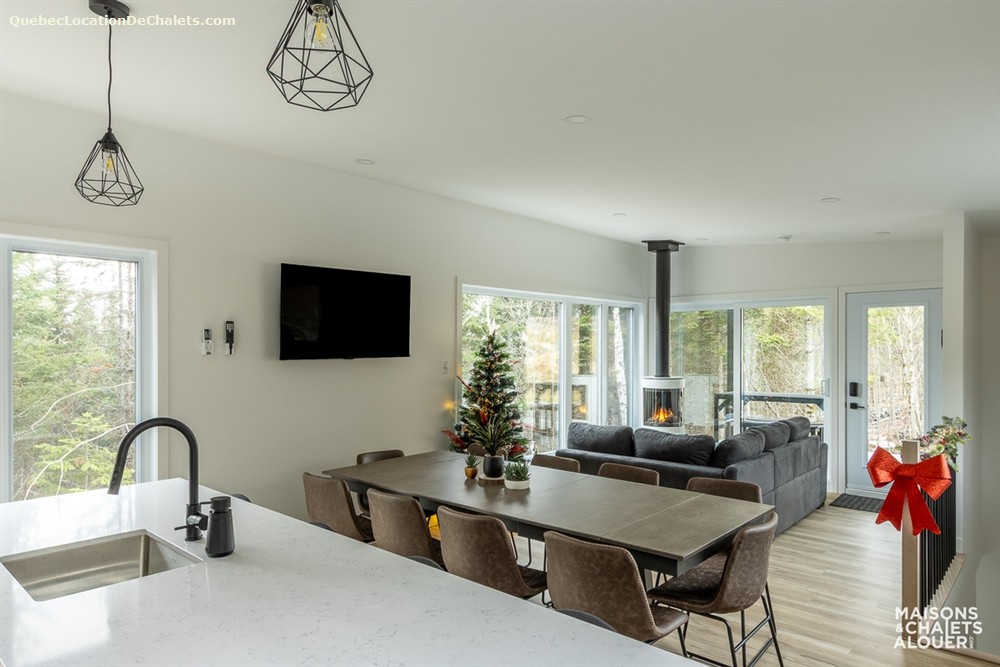 Conçu pour le confort et la détente, ce chalet à louer baigne dans la lumière naturelle grâce à ses grandes fenêtres offrant une vue sur la forêt. Les planchers chauffants du rez-de-jardin assurent une chaleur réconfortante après une journée d’activités. Vous pourrez vous détendre devant le foyer ou profiter du spa privé couvert 4 saisons, un espace intime et parfait pour admirer la nature en toute tranquillité.