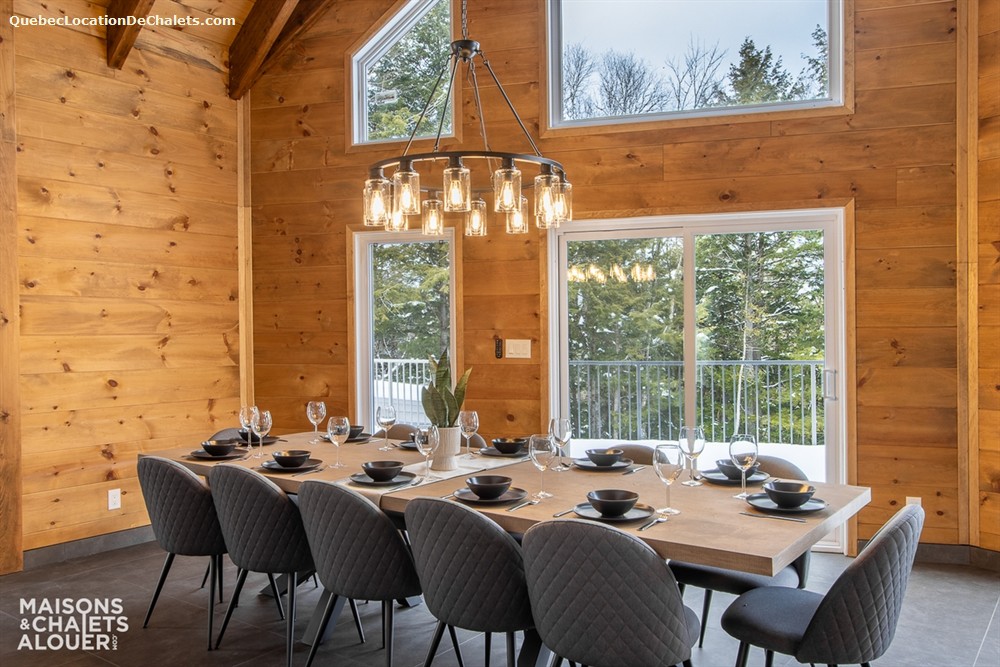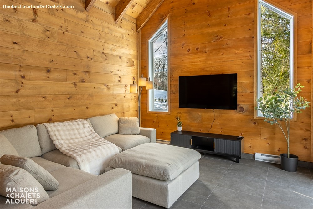 À l'intérieur de ce chalet à louer, l’odeur du bois et la lumière qui traverse l’immense fenestration donnent le ton : ici, tout a été pensé pour respirer et relaxer. Le salon s’ouvre comme une scène sur la nature. Les fenêtres du sol au plafond encadrent les saisons, les divans confortables invitent aux longues conversations et aux films de fin de soirée.