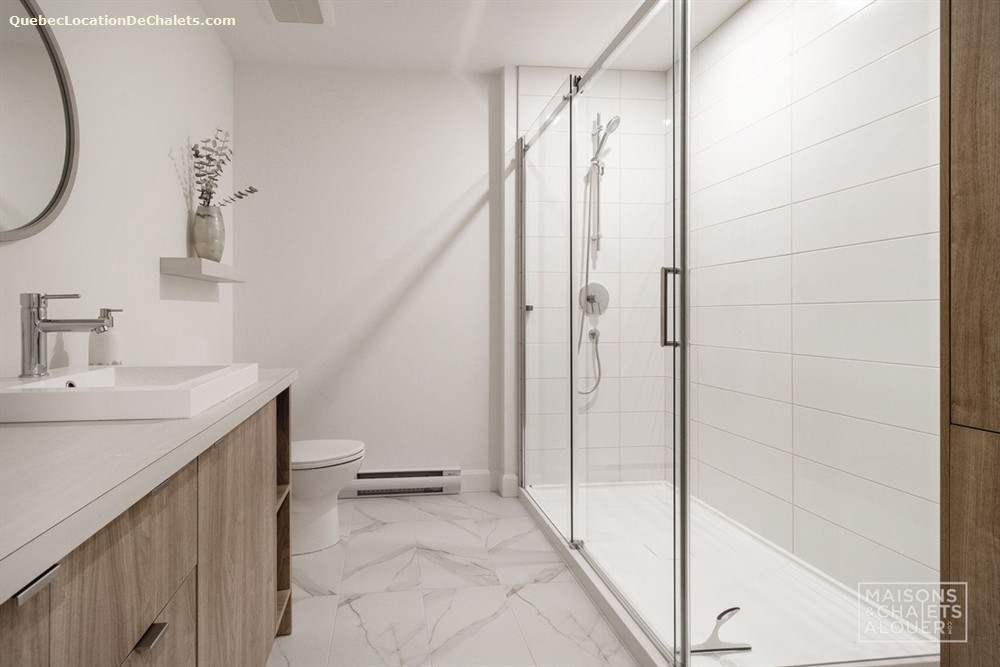 Rez-de-chaussée : Cuisine, salle à manger et salon  / Chambre #1 : 1 lit Queen et salle de bain avec douche attenante / Chambre #2 : 1 lit Queen / 2e Salle de bain avec bain et douche.