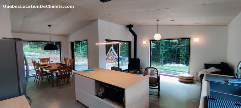 Une aire ouverte regroupe les pièces de vie. Le chalet offre une vue sur la montagne et aucun voisin visible. Les pièces de vie sont dans une aire ouverte lumineuse. De grandes fenêtres permettent une immersion dans la forêt.