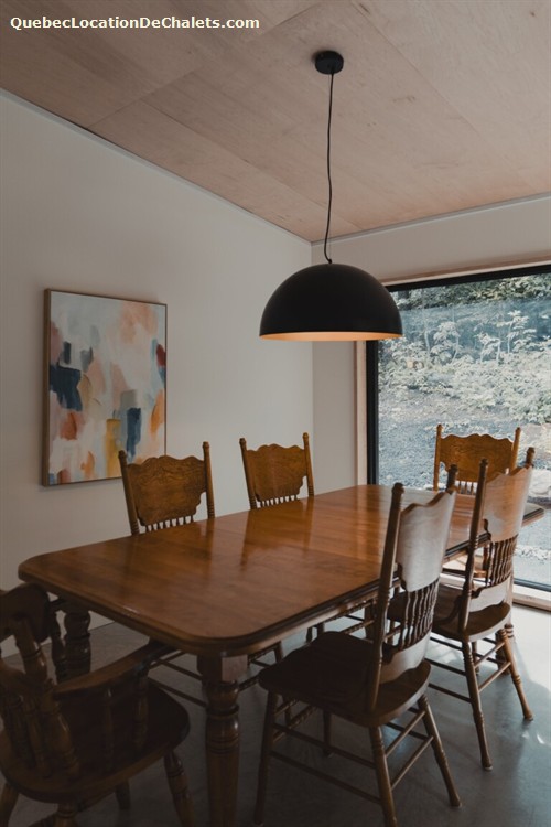 Salle à manger attenante, donnant sur la forêt. Grande table avec 6 chaises. Chaises supplémentaires et chaise haute disponible.