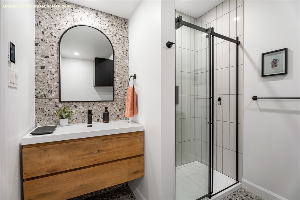 -SDB 1, rez-de-jardin: vanité simple, douche, buanderie laveuse-sécheuse