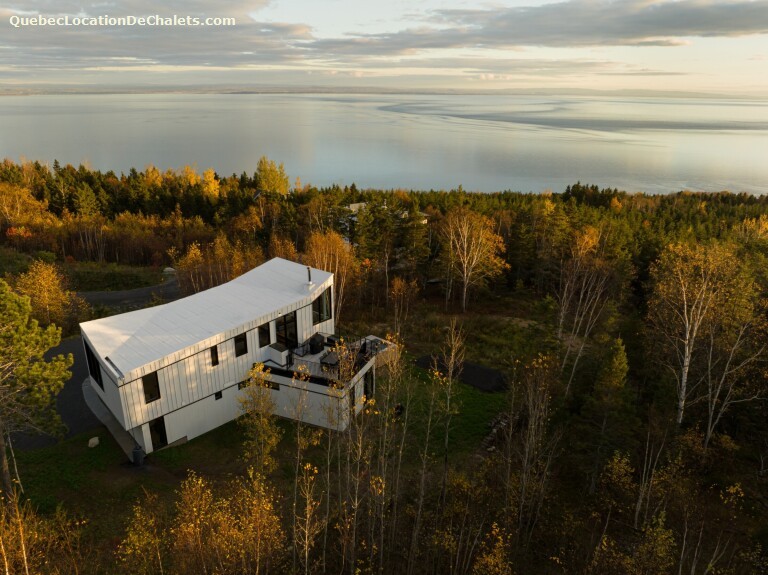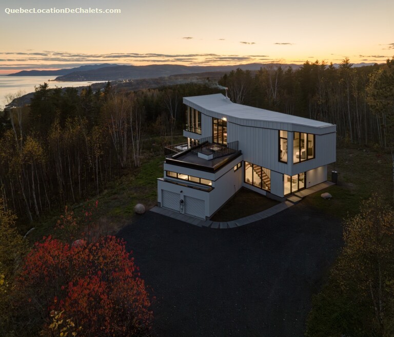 Cette maison contemporaine de luxe située à Cap-à-l'aigle (La Malbaie), dans Charlevoix, offre une expérience unique de séjour. L'ascension de la colline, puis de l'escalier de la maison, permet ces