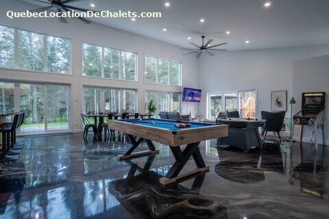 Salle de jeux : Table de billard, jeu d'arcade et table de hockey sur air pour des soirées de plaisir et de compétition amicale.