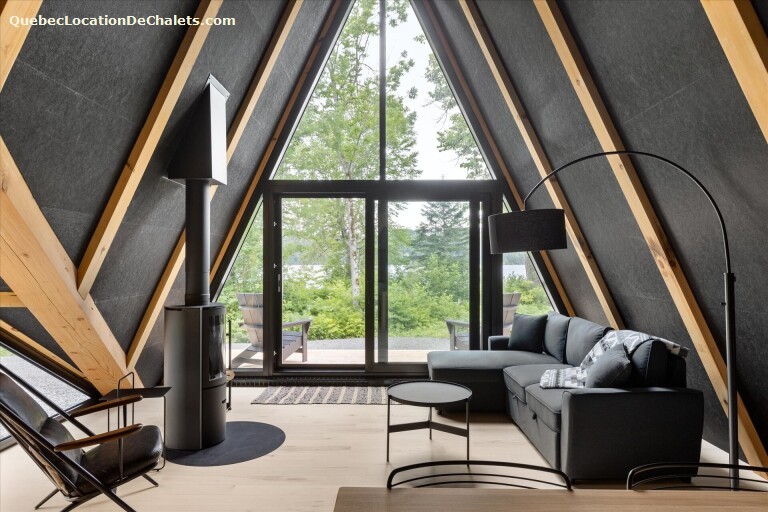 Espace salon avec divan-lit pouvant accueillir quatre personnes, dont une section allongeable pour un confort supplémentaire. Un fauteuil et une petite table centrale complètent l'espace détente. Téléviseur intelligent avec câble et foyer au bois pour des soirées chaleureuses et relaxantes.