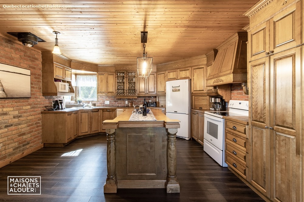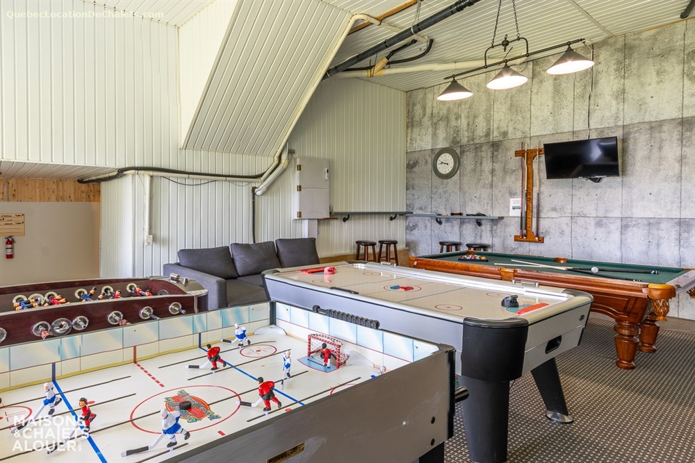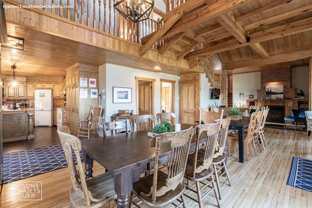 Cette maison de vacances chaleureuse où les boiseries sont à l’honneur offre 7 chambres fermées avec 6 lits Queen, 4 lits Double . Un lit escamotable Double est également disponible, le tout pouvant loger 20 personnes confortablement. La cuisine entièrement équipée communique avec la salle à manger et le grand salon à aire ouverte. Un foyer au bois, avec bois fourni, complète le salon où vous pourrez vous reposer après une journée d’hiver en plein air. Pour votre divertissement, vous trouverez également une table de billard dans le garage attaché à la maison.