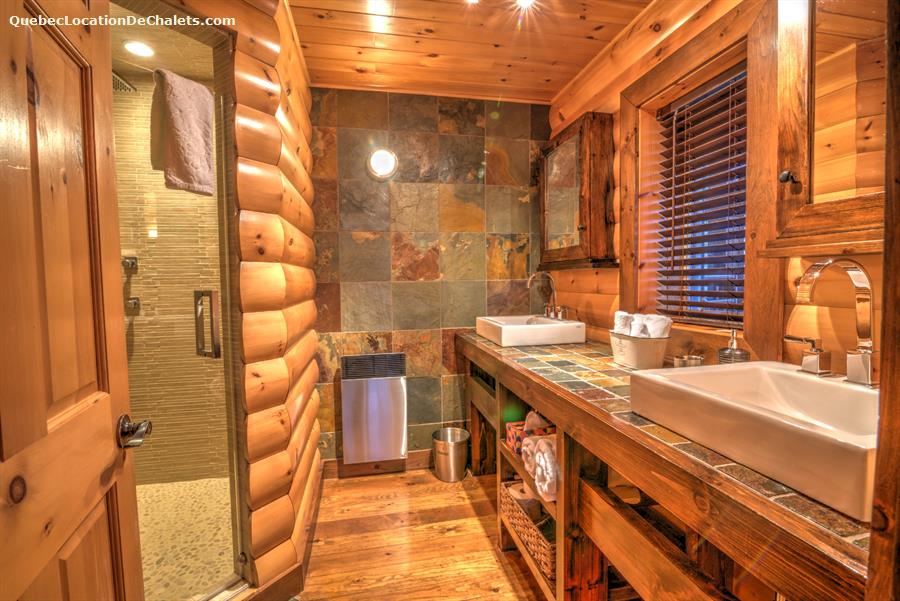 • Le niveau rez-de-chaussée vous offre une 5ième chambre à coucher, une salle à manger équipée d'une table fabriquée par un ébéniste pouvant recevoir 12 personnes, un salon équipé d'un mobilier confortable et offrant une vue splendide sur un manteau de foyer en pierre à la fois subtil et imposant sur lequel est accroché un téléviseur à écran plan de 46 pouces. La cuisine très fonctionnelle a été conçue spécialement pour pouvoir cuisiner en groupe.