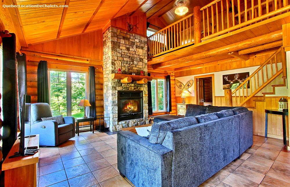 Salon avec foyer au bois avec manteau en pierres, téléviseur 43’’, télévision par fibre optique, barre de son Bose Bluetooth, lecteur blu-ray/DVD avec films à votre disposition, radio/lecteur MP3 compatible avec iPhone et Android (à l’aide d’un fil « jack » fourni)