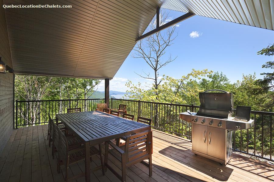 Pour votre plus grand confort, sa conception et sa construction ont été réalisées par vos hôtes, architecte et ingénieur constructeurs. La terrasse belvédère couverte, équipée d'un BBQ, de tables et chaises en bois d'acacia, vous permet de profiter plus longuement de la belle saison. Une 2ème terrasse avec chaises Adirondacks est idéale pour le café du matin ou l'apéro du soir. Le salon principal, largement fenestré avec double toit cathédrale en pin noueux, est équipé d'un foyer au propane et orné d'une télévision 49' et d'un panache d'orignal chassé par les propriétaires. Cuisine entièrement équipée avec îlot central, idéale pour cuisiner en groupe.