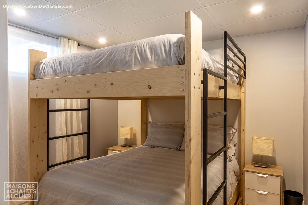 Cette propriété offre beaucoup d’espace et de luminosité et peut accueillir jusqu’à 10 personnes. Les pièces sont accueillantes et l’aménagement invite à la détente. Au rez-de-chaussée, la cuisine toute équipée et la salle à manger à aire ouverte ont un accès direct sur la belle grande terrasse par une porte-patio. Le coin repas avec vue sur le lac est parfait pour faire des repas sur le BBQ. Sur le même étage, il y a une chambre fermée avec 1 lit Queen, un joli petit salon avec sofa confortable et une salle de bain complète avec bain et douche. L’étage inférieur comprend deux chambres avec lits Queen et un espace à aire ouverte avec un futon et une salle de bain avec douche. Ce chalet à louer a vraiment tout pour plaire !
