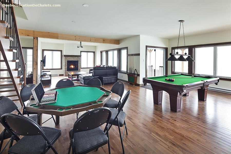 Le Mirador 3, compte 5 chambres avec lits queen, dont 3 ont en plus 2 lits simples superposés et une avec en plus 2 lits simples. La literie est entièrement comprise. Cuisine entièrement équipée avec îlot central, idéale pour cuisiner en groupe. Planchers en bois franc sur les deux étages. Le 2ème salon au rez-de-jardin, est équipé d’un grand modulaire en cuir, d’une télé écran plat 50 ‘’ avec système de son, d’un lecteur dvd blu-ray , d’une table de poker pour 8 personnes, ainsi que d’une table de billard, vous permet de vous amuser pleinement ! Foyer extérieur avec bois fourni.