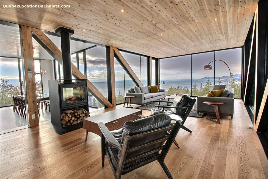 Les quatre chambres ont été localisées à l’étage central afin de maximiser le panorama des pièces de vie qui sont situées au dernier niveau. La cuisine et la salle à manger bénéficient ainsi d’une fenestration abondante à 360 degrés tandis que l’espace de séjour est logé dans un porte à faux vertigineux dont la forme singulière évoque la structure des ponts vernaculaires. Ce perchoir permet ainsi de profiter des couchers de soleil enchanteurs de Cap-à-l’Aigle et des reflets miroitants de l’estuaire du St-Laurent, et ce, à même le confort de la maison.